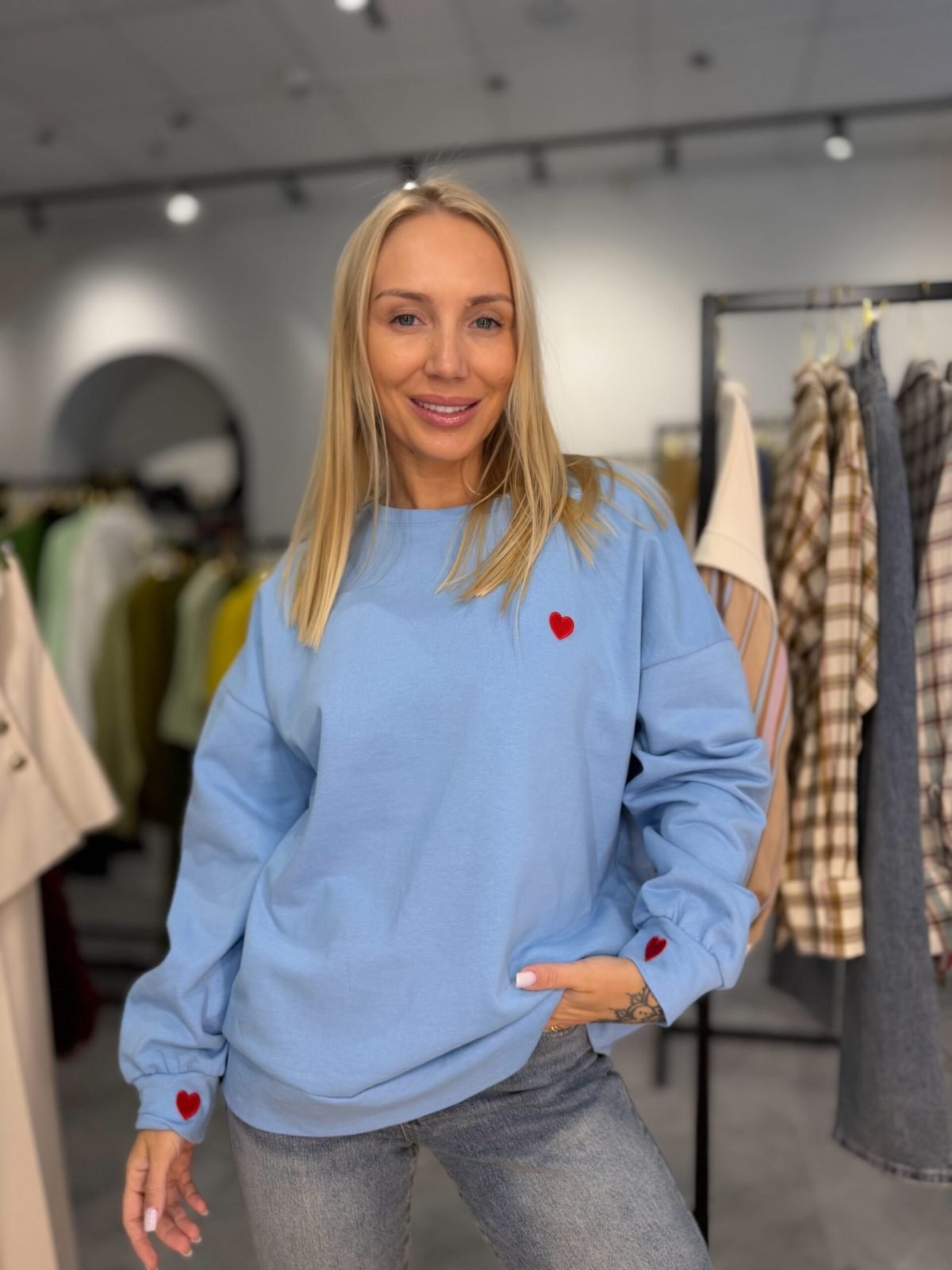 Mielas ir stilingas džemperis, kuriame akcentuota širdutės detalė prideda žavesio ir išskirtinumo. Audinys yra malonus ir švelnus prie kūno, pagamintas iš 65 % medvilnės ir 35 % poliesterio, todėl džemperis yra patogus, lengvai prižiūrimas ir puikiai tinka kasdieniam dėvėjimui. Pastelinės ar neutralios spalvos suteikia universalumo ir lengvai derinasi prie įvairių derinių.