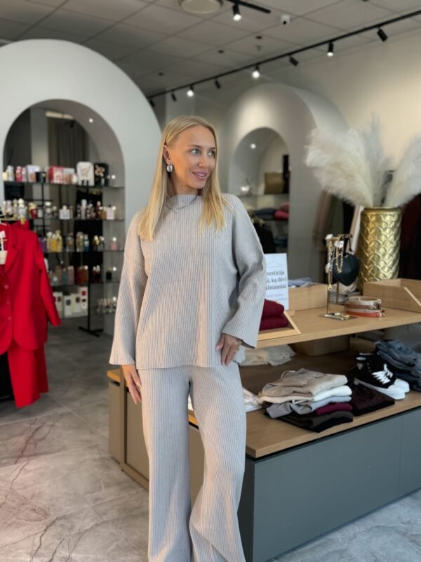 Kostiumėlis iš dviejų dalių – megztinis ir tiesaus kirpimo kelnės