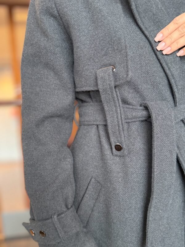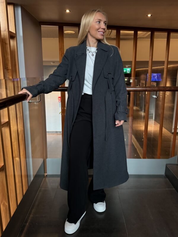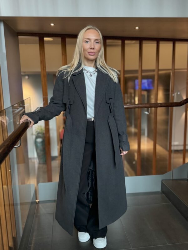 Stilingas pilkas paltas su dirželiu ir akcentais.