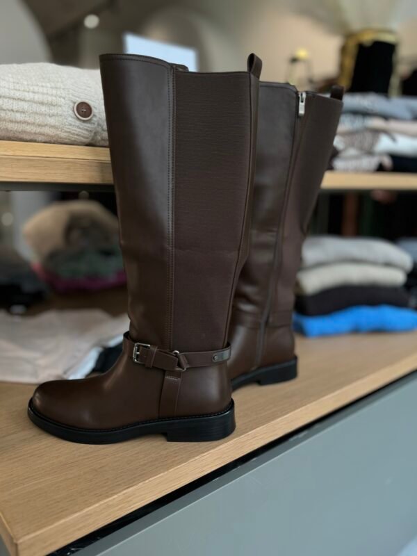 Šie ilgaauliai – tikras sezono perliukas! Derinant elegantišką eco odą su tampria guma, batai ne tik puikiai prisitaiko prie kojos, bet ir išryškina šlaunis, suteikdami vizualiai ilgesnių kojų efektą. Tampri guma per šlaunį užtikrina komfortą ir nevaržo judesių, o ypatingos detalės – dekoratyvinė saga ir stilingas dirželis – suteikia išskirtinumo bei subtilaus charakterio.