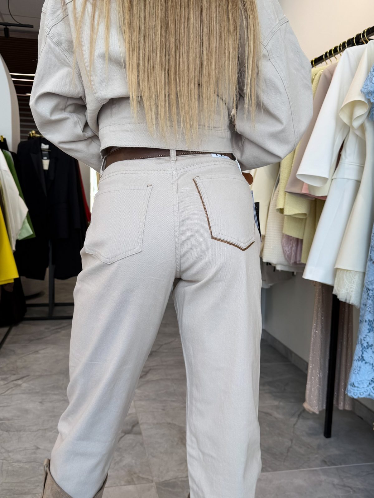 Gražūs ir stilingi beige spalvos džinsai – puikus pasirinkimas ieškančioms patogumo ir modernaus įvaizdžio. Švelni, universali spalva lengvai derinama tiek prie šviesių, tiek prie tamsesnių drabužių, todėl džinsai taps nepakeičiama garderobo dalimi.