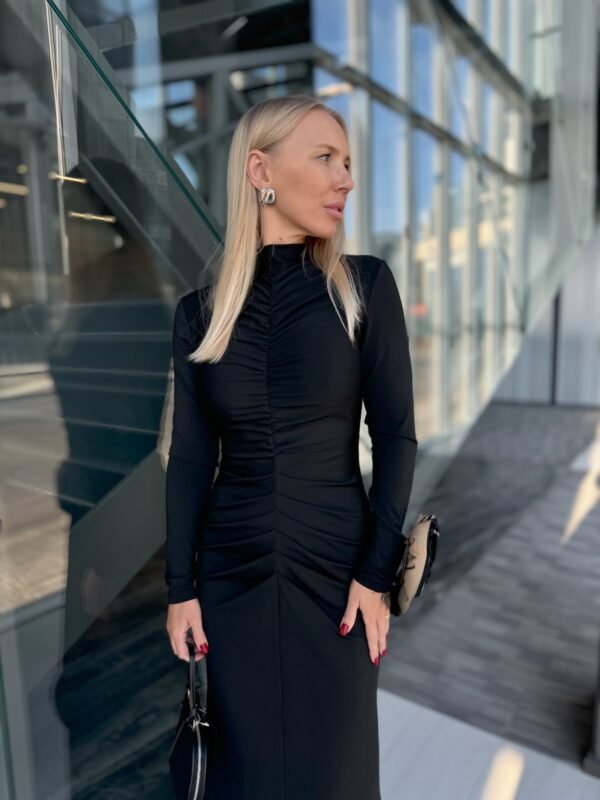 Elegantiška ir stilinga suknelė, išsiskirianti savo moterišku siluetu ir subtilia prabanga. Juodos spalvos audinys vizualiai lieknina ir pabrėžia figūrą, o tampri medžiaga užtikrina komfortą bei laisvę judėti. Suknelė idealiai tinka šventėms, vakarėliams ar ypatingoms progoms, kai norisi atrodyti rafinuotai ir jaustis patogiai.