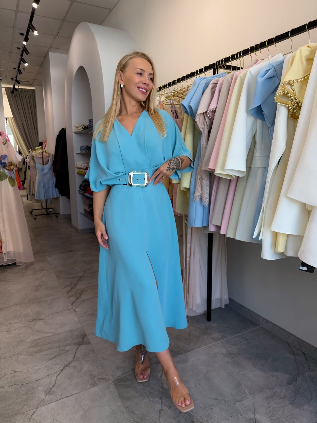 Prabangi, laisvo silueto suknelė, sukurta vertinančioms subtilų minimalizmą ir eleganciją. Ši suknelė išsiskiria švariu dizainu be papildomų detalių, todėl lengvai pritaikoma tiek kasdienai, tiek ypatingoms progoms. Lengvai krintantis audinys suteikia judesiui grakštumo, o siluetas leidžia jaustis patogiai ir užtikrintai.
